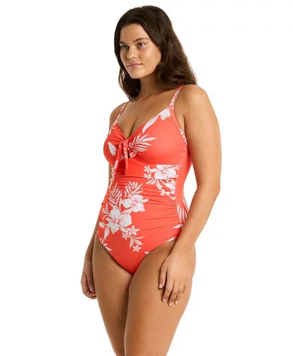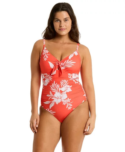 Sea Level's Aloha collection blends vintage motifs and 90's silhouettes with vibrant colours, conjuring images of tropical vacations and island nostalgia. The Aloha DD/E-Cup Tie Front One Piece is a must-have for a warm weather getaway.